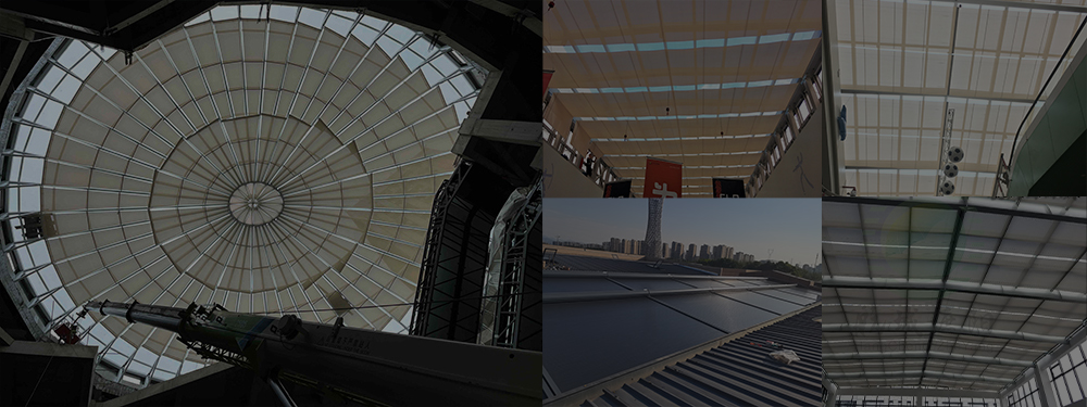 卷軸式方案,面料運行方向與原有結(jié)構(gòu)貼合度高,最大程度保持原有屋面結(jié)構(gòu)美觀